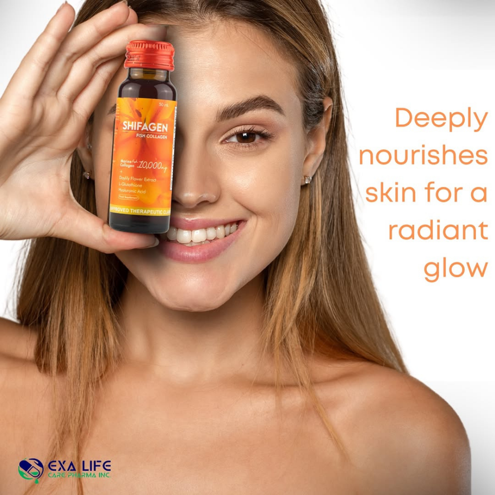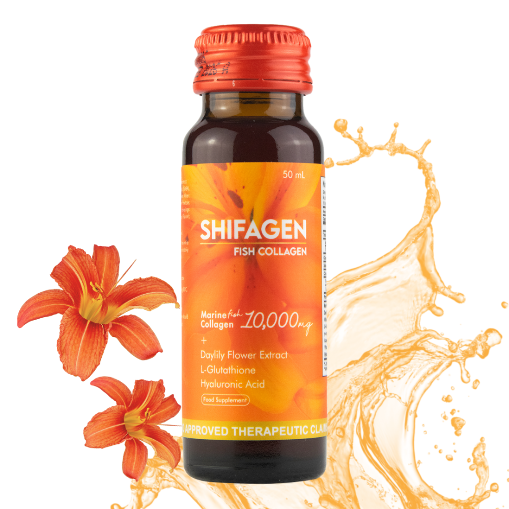 Shifagen is an Oral Collagen Drink that offers a wide range of benefits for your skin and overall well-being. It enhances skin collagen density, brightness, and hydration, while also tightening the skin, reducing pores, and diminishing skin spots. Additionally, it promotes tranquil sleep and a calm mind.